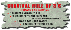 Preživjeti 3 minute bez kisika ili u ledenoj vodi. Preživjeti 3 sata bez skloništa (u teškom okolišu). Preživjeti 3 dana bez vode (ako imate sklonište). Preživjeti 3 tjedna bez hrane (ako imate vodu i sklonište).